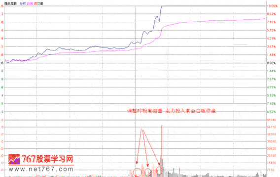 600662,强生控股,我们仔细看2010年3月26日的走势,该股十一点后四波涨停,图不是很大,注意看上涨时量能放的很大,回调时量能极小,肉眼看似乎只有上涨的四分之一不到,我们通过观察这个量能结构就知道主力是投入真金白银在里面的,不存在对到出货的可能,临盘时可适量参与。