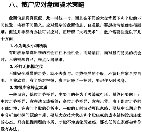 庄家出货前常用走势设置多头陷阱,或是尾市故意拉高,或是突然放量向上突破横盘整理区域,或是逆市放量拉升,或把上升通道修得四平八稳,让散户跟进落入陷阱