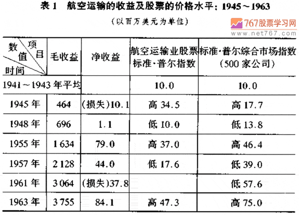 航空业的毛利润一直是迅速和连续地增长,但它们的净收益有很大的波动。在1961年出现赤字;而从1945年至1957年,在所有的业绩中,这些股票的标准。普尔指数是很低的,但综合市场指数有很大上升(一些相关数据参见表1)。这个业绩对我给出的警告有个清晰的认识。航空工业成绩的改善开始于1962年,其反映在股票改善的指数水平高于平均恢复指数水平。