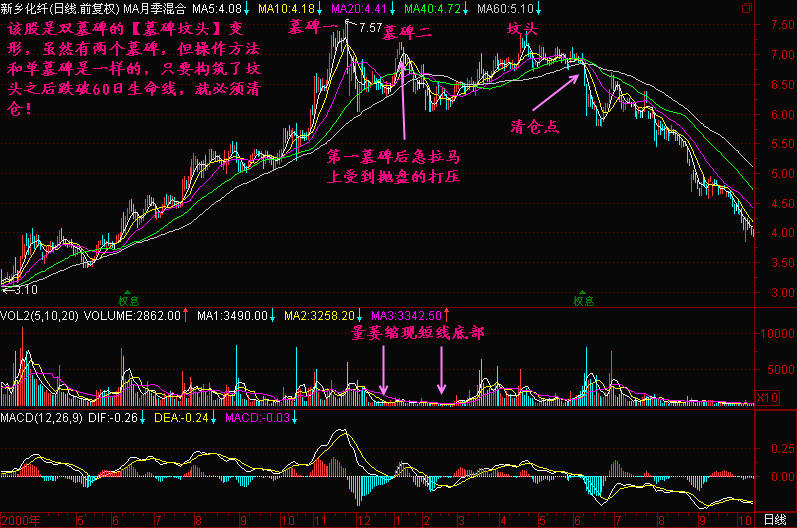 所以【坟头】的形成是一种市场行为,庄家走到这一步,也只能采用【墓碑坟头】的模式来出货。从【单墓碑】变化到【双墓碑】,并不能改变【墓碑坟头】的原理。