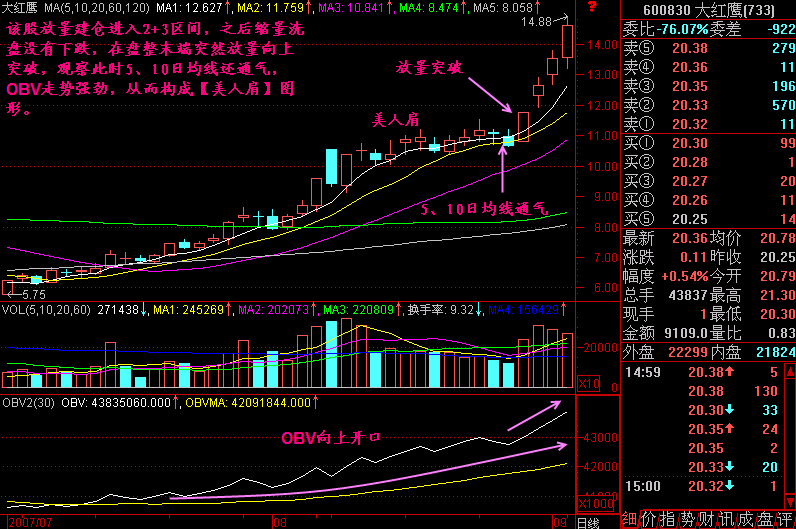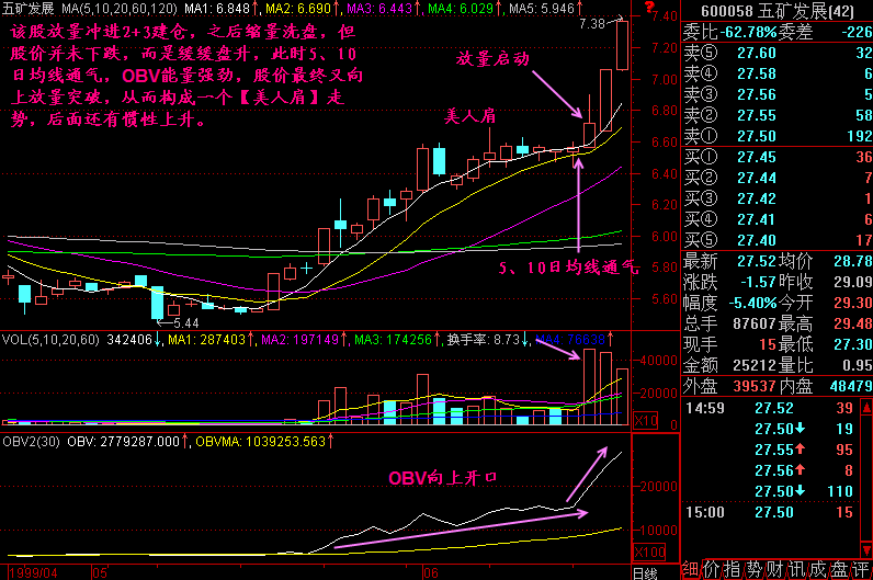股价在第一波放量建仓之后,往往进入缩量洗盘阶段,这个时候个股将出现分化,对于那些弱庄股将出现回档较深,5、10日均线死叉的情况,而有相当少部分的股票会出现股价并不下跌,缩量盘整或盘升的状态,这个时候5、10日均价线保持通气,只要能量注入,成交量放大,股价向上突破,这就构成了【美人肩】了。