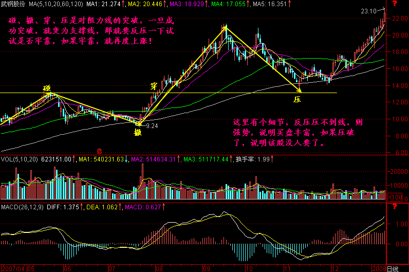 【碰、撤、穿、压】是对阻力线反复夯实确认的过程,一旦获得成功,将再度发动行情!当反压的时候,如果还没反压到位就止跌回升了,说明主力买入心情比较急切,这样的股票强势,如果反压破了的,要具体问题具体分析,如果是因为指数不好造成的,可看情况分辨,如果指数没事的时候压破线的,那就说明该股的主力买入很不积极,也许该股根本没有真正的主力,仅是某个大资金的小打小闹而已,这样的话就要谨慎了。