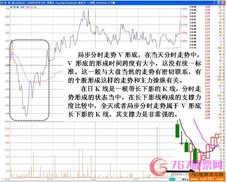 本文内容介绍在K线下影线出现V形反转在分时盘口上的判断技巧。文章深入盘面分时走势从盘口分时走势中深入研究探索个股出现下影线时,股价和当天的分时走势的表现形成支撑和的反转多空力量比较和发展步骤。