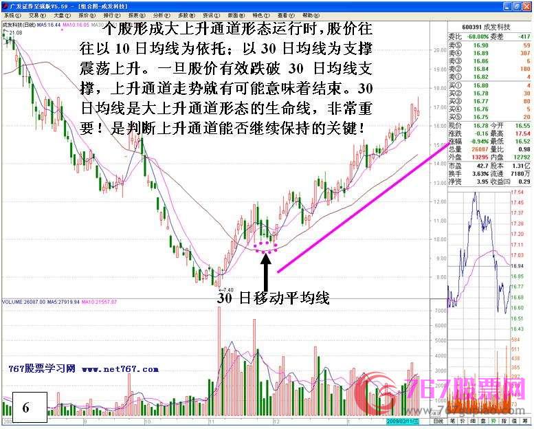 在年市或者阶段性强势市场中,一般会出现占超过两市3%的个股在震荡上升时日K线走势形成比较标准道式走势。上升通道形态的角度有大有小,一般状态下上升通道形态角度处于三十度至六十度之间,以四十五度度最为标准。