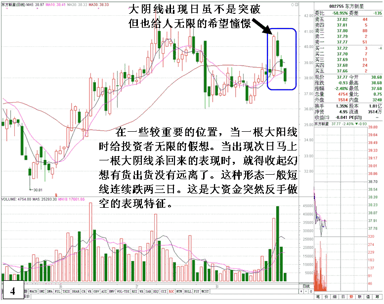 由于单根K线由4组数据构成,实力机构较容易通过操纵影响单根K线的结构。在实际交易中主力人为通过操纵K线欺骗投资者常有发生。技术派在分析时要掌握一定的甄别能力带眼识K线!我们长期研究K线发现一种规律:“大阳线过后马上就是一根大阴线杀回”。个股出现这样的两根连续K线大都不是什么好事。
