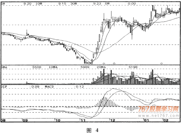 图5,民生银行(600016):股价见底后向上回升,当升幅超过10%后进行短暂的平台整理,不久股价向上运行,形成左肩。当升幅超过20%后股价回落,形成头部。在股价回落到左肩附近时,进行短暂的平台整理,然后向下调整,形成右肩(其实右肩并未有效形成),于是出现一个头肩顶形态。可是股价并未出现头肩顶的“量度跌幅”,不久股价重返升势,展开主升段行情。这也是怕跌心理下的操作失误。