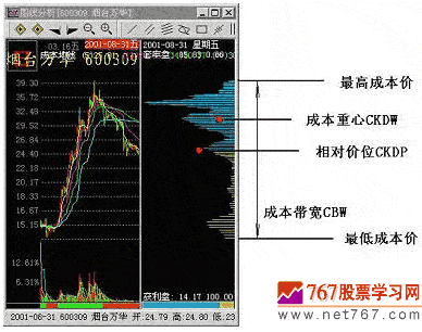 既然高和低是相对的,那么相对于什么,就很有说法了。其实,KDJ(随机指标)从本质上说就是个相对价位,该指标的市场含义是:股价在9日内最高与最低之间的平均相对位置。还有一个指标叫RPY(年相对价位),它定义为:股价在循环年度中的最高与最低之间的相对位置。CKDP也是这样一类指标,它所相对的最高价,是持仓成本最高的那些筹码的价位;而最低价,则是最低持仓成本所在的价位。我们把最高价与最低价之间的空间分成100份,价位最低的那一份为CKDP的0位置,在CKDP为0的状态下,当前股价等于最低持仓价。而CKDP处于100%的时候,则表明当前股价是最高持仓价。通常情况下,CKDP的数值位于0到100之间。