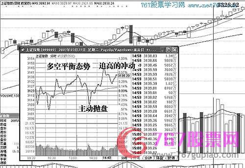 我举一实盘分析的例子,下图是上证指数2007年3月26日的分析走势,上证指数在经过了上周周四周五洗盘,特别是上周五快速深幅的下跌和拉起动作后,短期的获利盘被有效清洗,3月26日股指跳空高开说明了市场整体做多的投资冲动,随后连续两波的震荡走底击穿了昨天的收盘位置,其原因是上周五下探中极少的主动抄低介入的短线资金的获利出局。也正是他们的出局,使指数的分时走势在上午10点多的时候快速下调,致使当天的买盘缩手观望,才出现了分时走势上无量快速下调。但是当我们看到强大的买盘蜂拥介入并把指数快速推高到当日高开以上的位置时,我们立即应该明白今天的走势应该是一路飘红持续走高的态势!因为在短期获利盘被有效清洗而大量场外空仓资金积极买入背景下,长线获利资金也就是股民的持股心态愈加稳定,何来大幅做空能量?特别在下午2点以后,指数一直运行在分时的高位,前几天和当日出局的短线资金被迫高位回补入市,致使指数尾盘加速上涨!