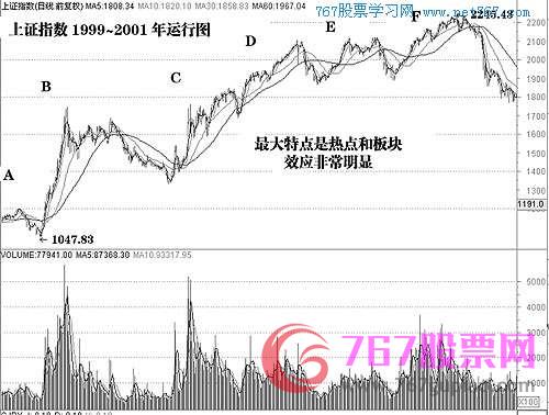 (4)随着市场多空的分歧的加大,股市在活跃之后走出了M头形态的调整走势,此时多数个股在放量震荡之后开始下跌,惟有银行股走出了上行走势,靠其权重把上证指数慢慢推高到2000点。当时“一九”行情非常明显,包括很多市场人士都在大谈价值投资,并提出其他个股都被边缘化的论调。
