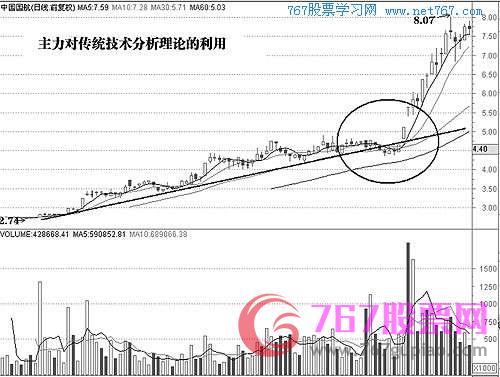 601111中国国航在2006年9月到12月期间,走出了一波沿切线震荡上行的行情,在12月21、22、23日出现了连续阴线的下跌,从而击穿了传统理论上的下切线支撑!也就是技术上所讲的“破位”,迫使场内持股者中线出局,然而当股价在相对低位窄幅运行后,尤其在第三天走势上波澜不惊,让很多技术人士认为是技术上的无量反抽,卖出在启动位置!第二天跳空高开瞬间封停,手法之凌厉让人叹为观止。此后仅仅两周股价从4块多涨到8块左右,几乎翻倍!