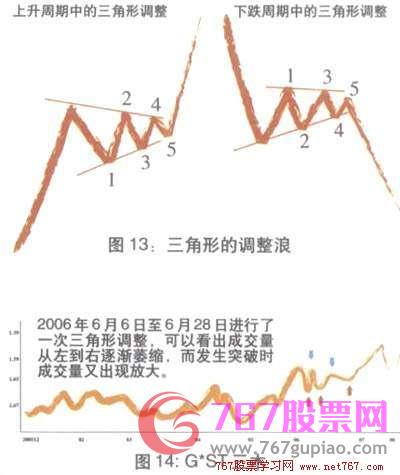 波浪运动有时会以一种三角形的运动方式逐渐收敛变窄或者逐渐发散放大,同时伴随着成交量的逐渐递减。三角形的结构往往表明市场即将在运行方向上作出选择,即继续沿着发生三角形整理前市场的运行方向前进。就是意味着,上升趋势经过三角形整理后依然会继续上升,而下跌趋势在三角形调整后还要延续原趋势继续下跌。