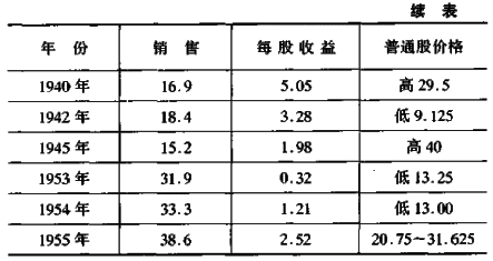 在1936年至1955年间,该公司的盈利几乎在不停地上下波动,1950年达到这期间股价最高点,每股5.08美元,3年以后又跌到最低点,每股0.32美元。如表40所示,股市价格比股票的实际价值低且被认为是垃圾股。现在每股的净值为28美元,市场价为42美元,盈利为1.21美元,每股分红12.5美分,另有5%的配股。但在1954年每股售价为13.75美元;在1964年公司销售额为3330万美元,净收入为69.30万美元,有47.30万流通股。