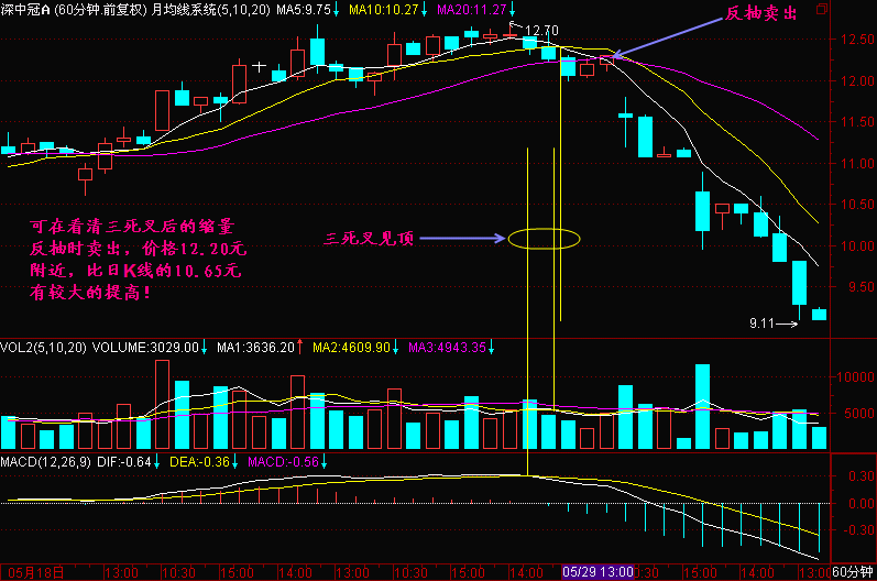 该股经过以上的四个周期一同分析,可得出60分钟K线图上那个三死叉出现后的缩量反抽高点应该坚决出货的结论,那么出货价格就比看清楚日K线图上三死叉时提高了不少!