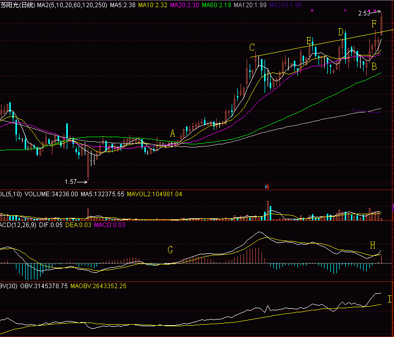 现在,K线正在加速上升,且放量了,股价比C点也高出百分之三了,现在开始分批买入。买的时候要注意,先买一部分,一旦拥有别无所求。