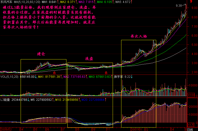 我们总说“量是对价的肯定”!但这个量的情况,到底是主动性买入多?还是主动性卖出多?我们从日K线的成交量柱体图上是没法很确定的得到答案的,我们必须把日K线成交量柱体分解出主动性买卖量来,并把一段时间的主动性买卖量累积起来,这就是L3能量,通过该能量体系就能够观察一只股票某个阶段的主动性买卖量情况,从而为我们把握庄家的进出情况提供了依据,这样才能在该买入时坚决买入,该卖出时坚决卖出!