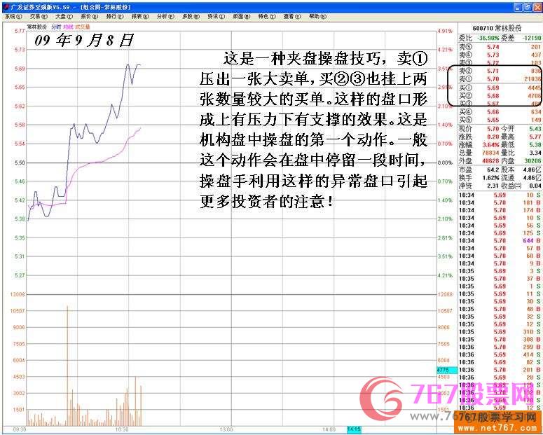 主力做庄,拉高股价的目的是为了盈利和兑现!主力机构运作一个股,在拉升过程中有时会进行差价操作,波段性差价操作是很常见的。在波段高位主力机构拉升过程中边拉边派是常见的一种出货手法。在拉升过程中为了顺利达到出货的目的主力操盘手会操纵制造各种各样的盘口引诱一般投资者或其他机构入场接货。下面案例:600710 常林股份 ,在这几日上演了一则经典波段性差价出货诱多盘口。