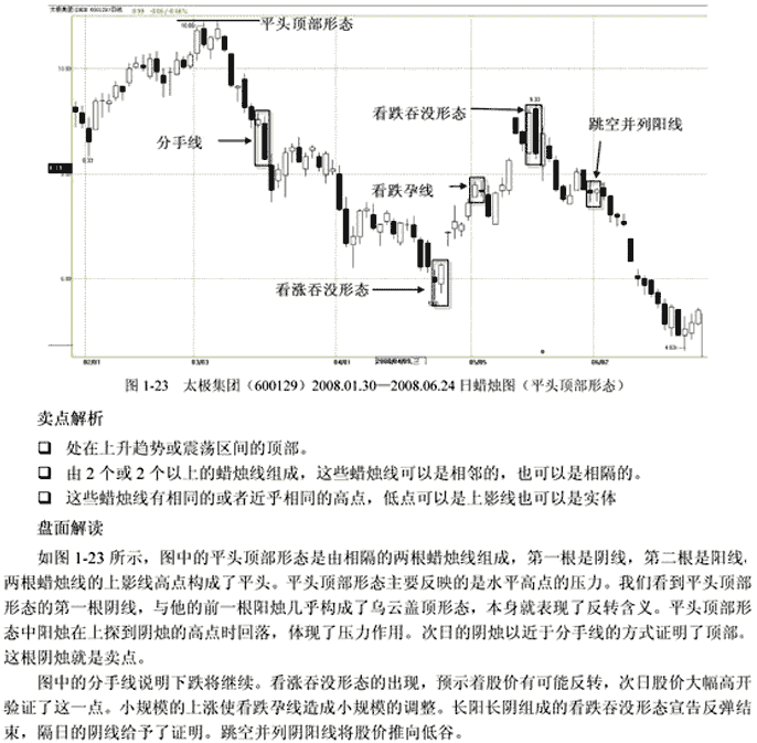 在连续上涨之后,市场在第5日向上摸了一下顶,被打出了一根上影线,第6日多方又尝试摸那个新高,结果又被打了回来,甚至还收了根小阴线。这意味着在新高处的抛售压力较大,两次“摸高”受挫,使后市不容乐观。注意,平顶的K线不一定是要相邻的,可以由相隔较近的K线来组成,它的意义在于为市场能否突破近期的新高提供了参考依据。