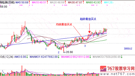300012,华测检测,在2010年1月、2月两个月份构成了三川底部形态,图中很明显看到三重底子,突破颈线后构成趋势最佳买点,前面还有个均线最佳买点。创业板的股票在我这次自今年二月份开始的底部形态创作案例中占了90%,希望能对朋友做了很好的暗示,大盘上下折腾时高成长性个股才是最好的机会,创业板就是此类股的集中营。